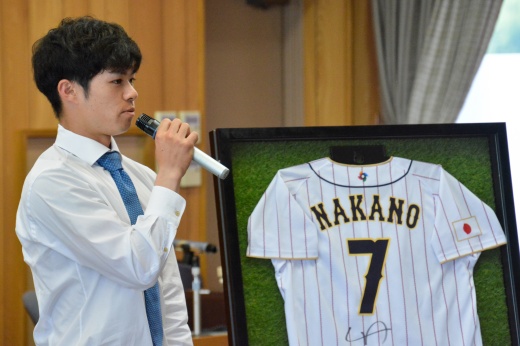 「2023 WORLD BASEBALL CLASSIC」で侍ジャパンのメンバーとして優勝に貢献した中野拓夢さんに特別功労賞を授与しました。