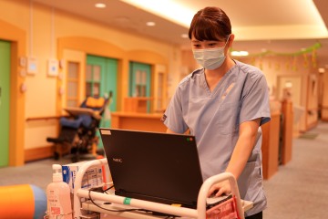 今は内科病棟で働いています。2つフロアがあって、1つは短期入院するお子さんと、もう1つは長期入院するお子さんのケアや退院に向けたケアが中心です。入院中のお子さんに付き添っているご家族にも合わせて寄り添った看護を心がけています。